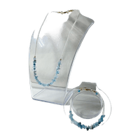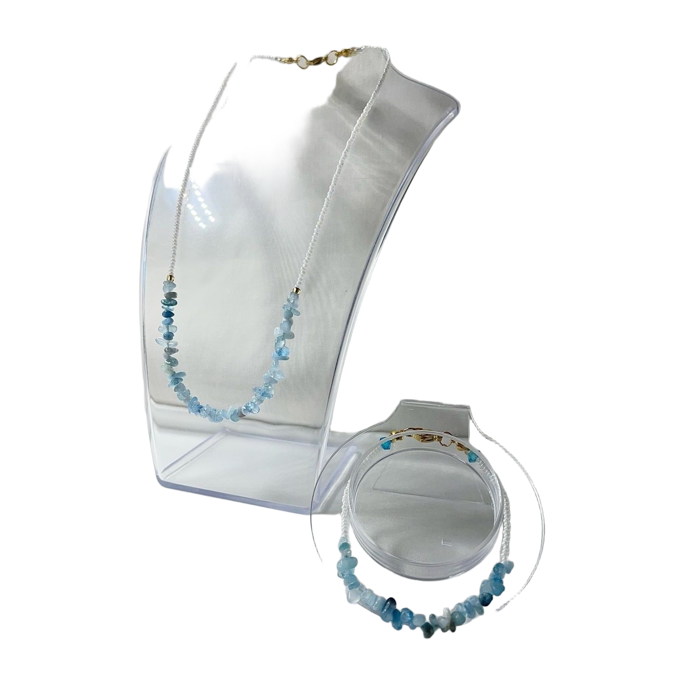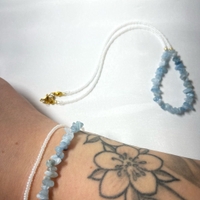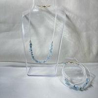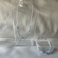 Käsintehdy korusetti sisältäen kaulakorun sekä rannekorun. Molemmissa käytetty akvamariini luonnonkiveä sekä pieniä helmiä.