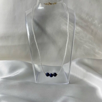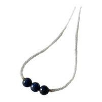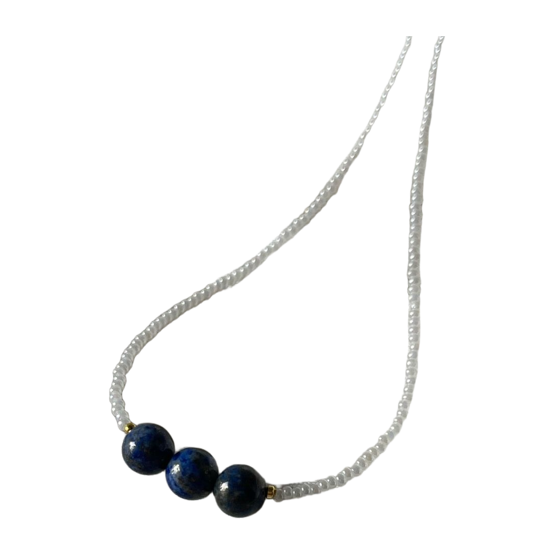 Käsintehty kaulakoru pienistä lasihelmistä sekä lapis latsuli luonnonkivihelmistä.