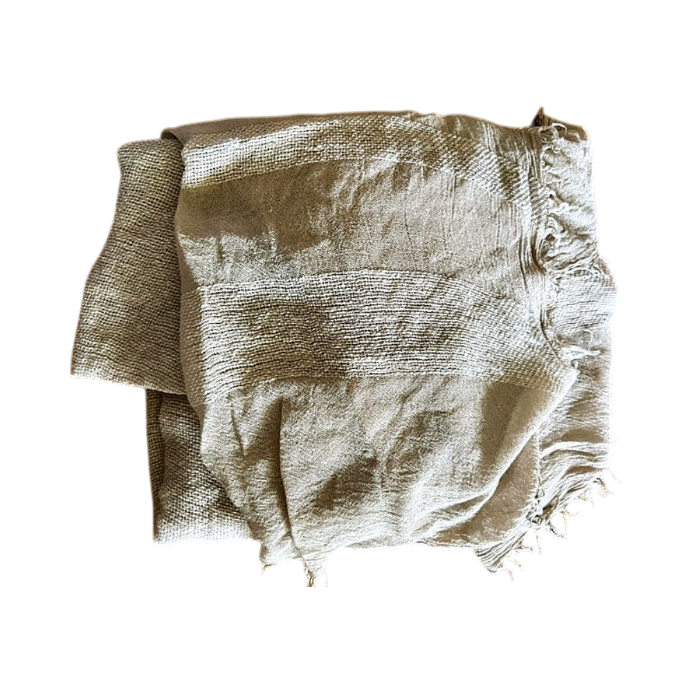Beige huivi, jossa hapsut reunoissa. Sain lahjaksi ja tämä on jotain 100% luonnonmateriaalia - en muista mitä. Joko pellavaa tai alpacaa.