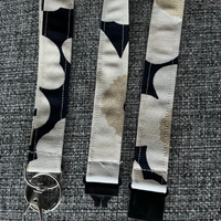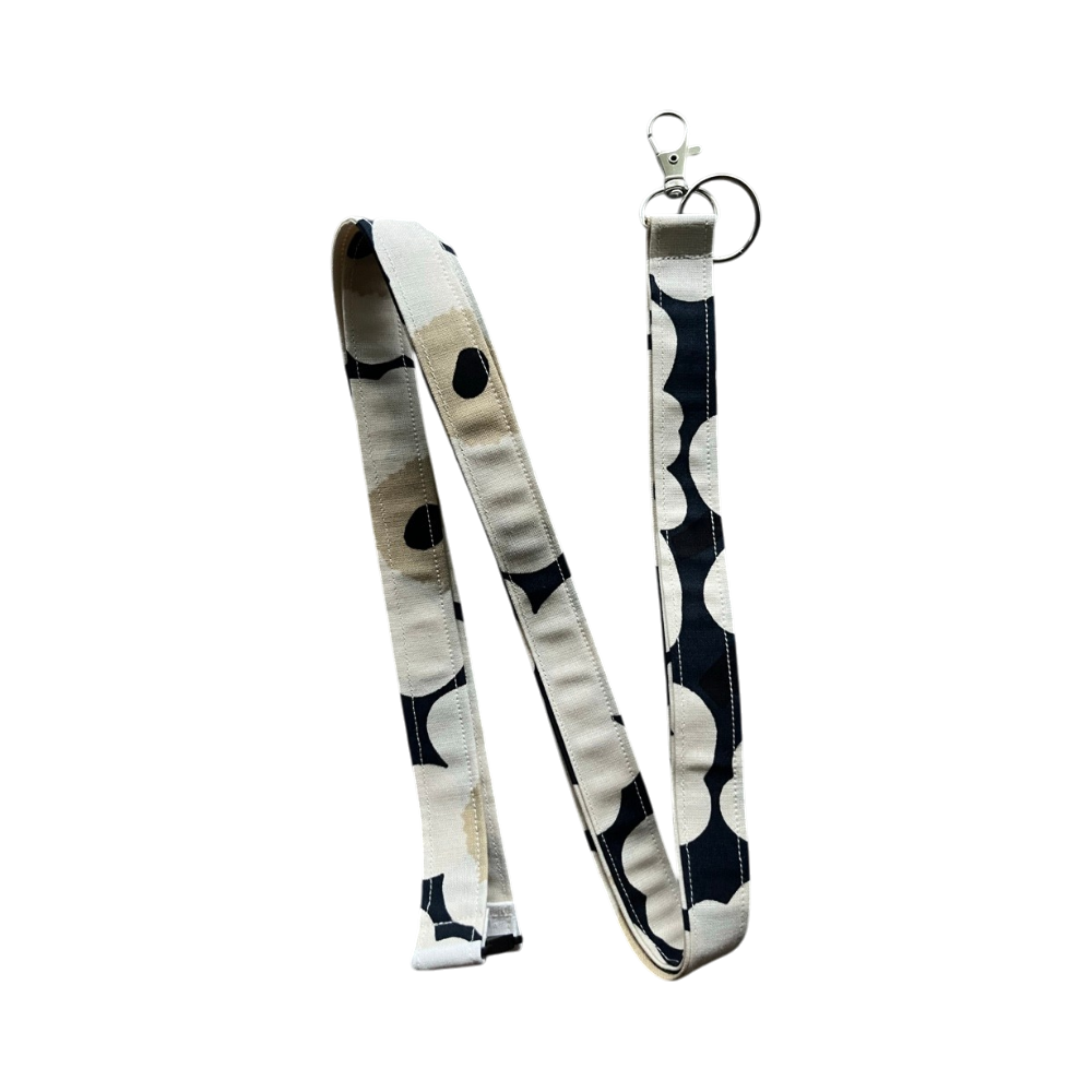 Kankainen avainnauha olan yli, pituus turvalukosta avainrenkaaseen n. 72 cm.