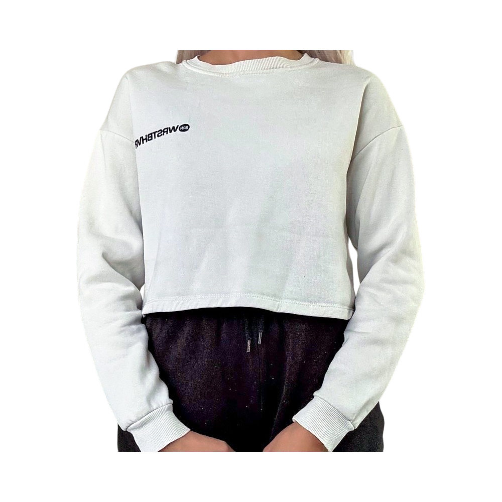 Trendy white cropped sweatshirt with black text print. Size S/M. Soft and comfortable fabric, perfect for everyday wear, school or casual streetwear looks. Easy to style with jeans, shorts or skirts. Good condition.