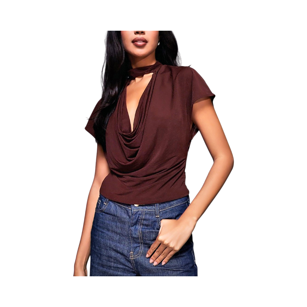 Tyylikäs ruskea toppi lyhyillä hihoilla ja kauniilla kaula-aukolla.