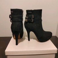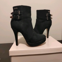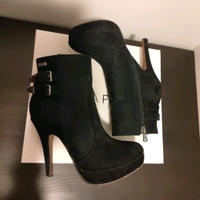 Upeat mustat nilkkurit hopeisilla solkikoristeilla. Samettimainen pinta, korkea korko. Kulumaa etenkin pohjissa.