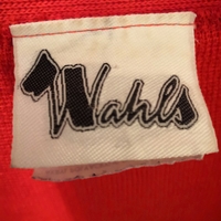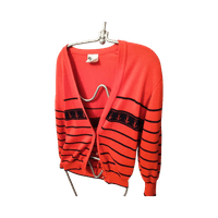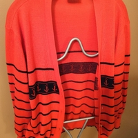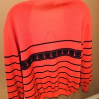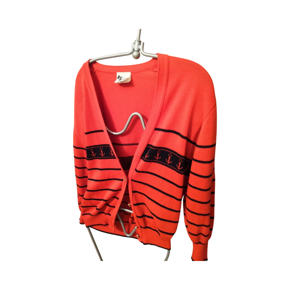 Punainen raitaneule, ankkurikuvioilla, napit edessä. Huom! Ylin nappi puuttuu, muuten oikein hyvä kunto. Valmistettu Ruotsissa.