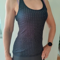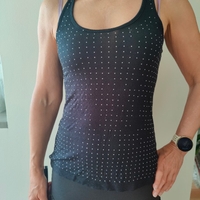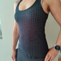 Musta toppi, edessä hopeanvärisiä pieniä nastoja. Muutamia nastoja irronnut, näkyy kuvissa.