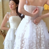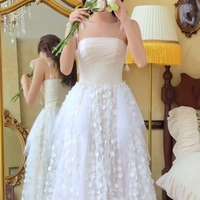 Soft tulle with dainty flowers shoulder straps add a touch of sophistication. Ruched bodice, floral appliqués. Whimsical princess style. High quality fabric with layers, not see through at all. The chest area have cup support.