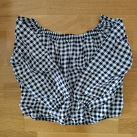 Off-shoulder ruudullinen pusero, joustokaulus ja pitkät hihat.