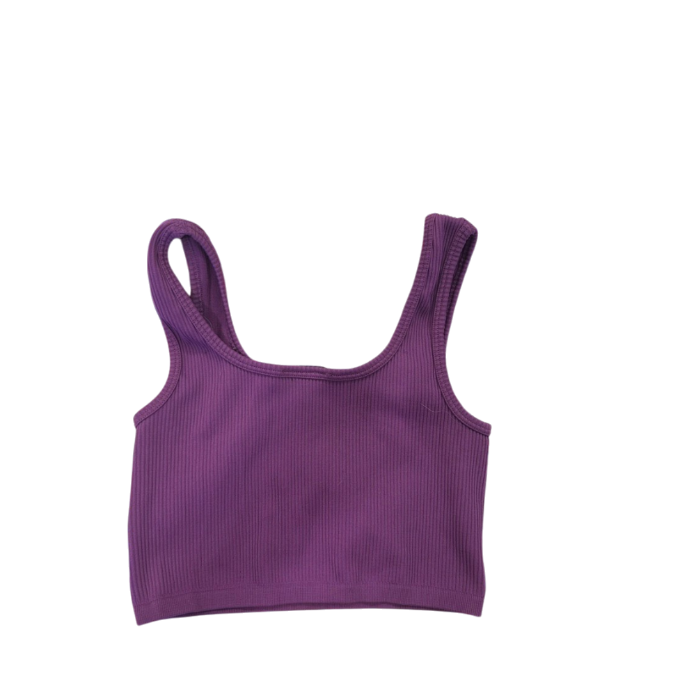 Lyhyt ribbattu toppi, ympäriolkaiminen, stretch-materiaali.