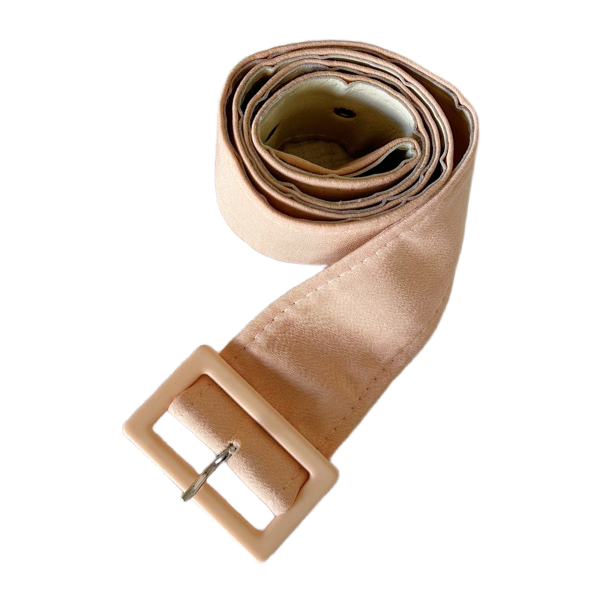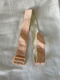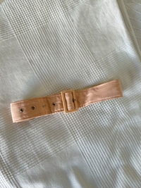 Ihana vaaleanpunainen / persikan värinen vyö. Etupuoli kangasta ja toisella puolella nahkaa. Siistissä kunnossa. Mitat: 83 x 4,5cm.