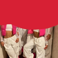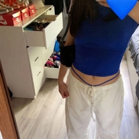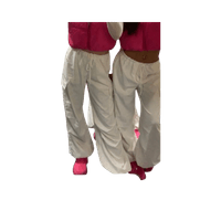 Valkoiset, leveät cargo-housut nyörivyötäröllä.