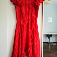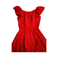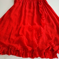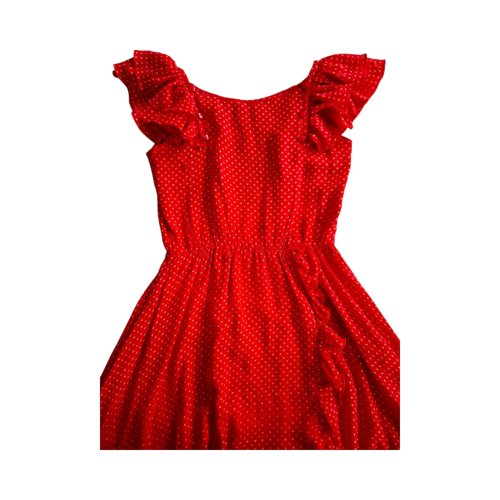 Aivan ihana vintage Valentino, jossa upeita yksityiskohtia: röyhelöt helmassa ja olkapäillä, kietaisumallinen helma (ei oikeasti kietaisumekko), sivuilla taskut, runsautta ja volyymia helmassa, leikkaus vyötäröllä korostaa muotoja, nappidetalji olkapäiden edessä, täydellinen midi-pituus.