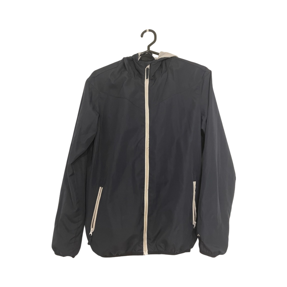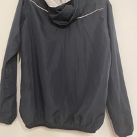 Sininen umbron tuulitakki verkkovuorella. Sisäpuolelle merkitty aiemman omistajan nimi (viimeinen kuva). Hyvässä kunnossa