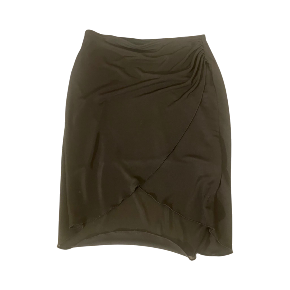 Elegant black wrap-effect midi pencil skirt, lightweight fabric.