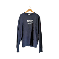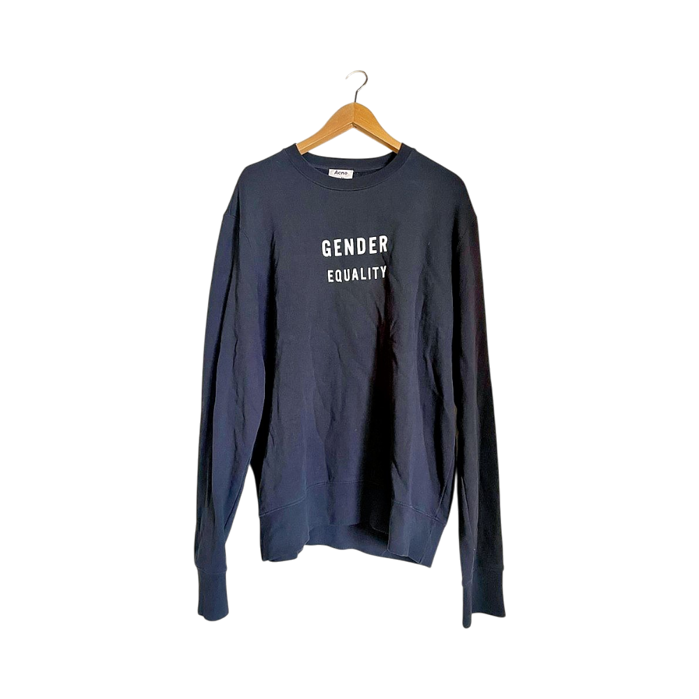 Musta Acne Studios collegepaita, teksti Gender Equality edessä.