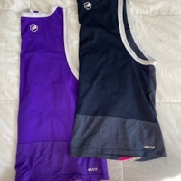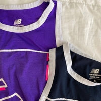 Kaksi New Balancen treenipaitaa (liila ja tummansinen) kokoa S
