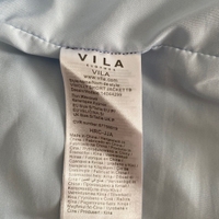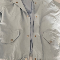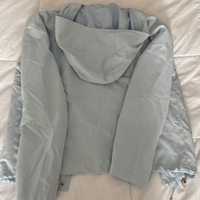 Vaaleansininen, hupullinen ohut päällystakki napeilla. Edessä kaksi taskua. Vyötäröllä kiristysnauhat. Kokoa S.
