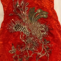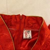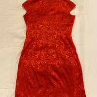 Kiinalaisen uudenvuoden mekko kokoa S (lapun mukaan M). Tyköistuva ja reisipituinen. Merkki ei tiedossa, mekko on mahdollisesti käsityötä.