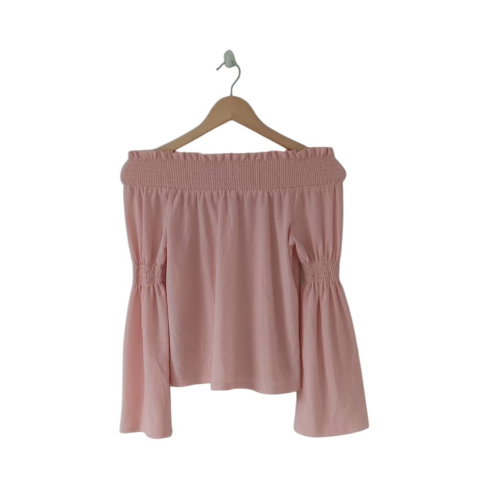 Off-shoulder toppi, smokkireunus ja levenevät hihat.
