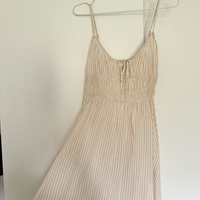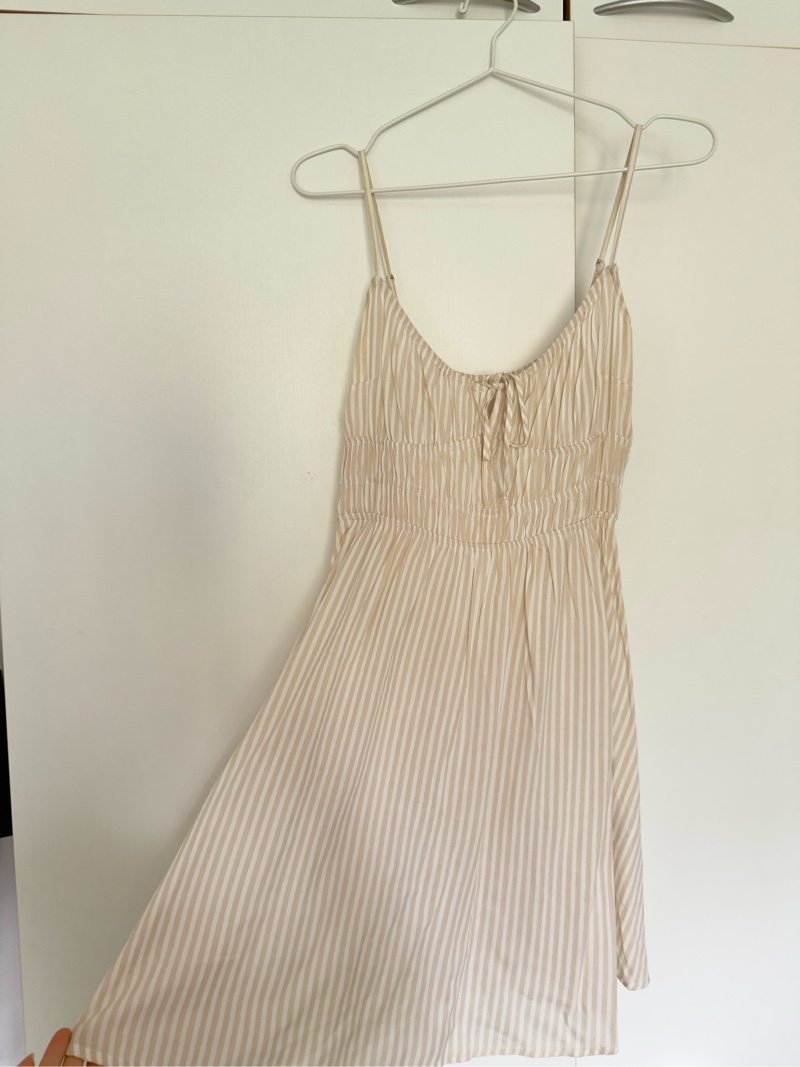 Kevyt beige-valkoraidallinen mekko ohuilla olkaimilla.