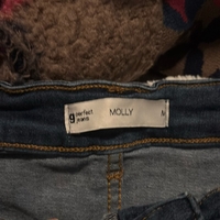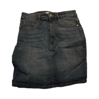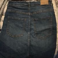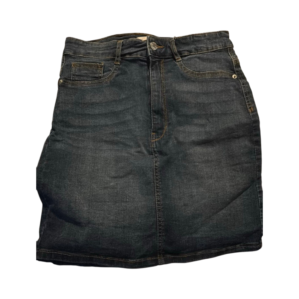 Tummansininen denim-hame, napitettu vyötärö, takataskut.