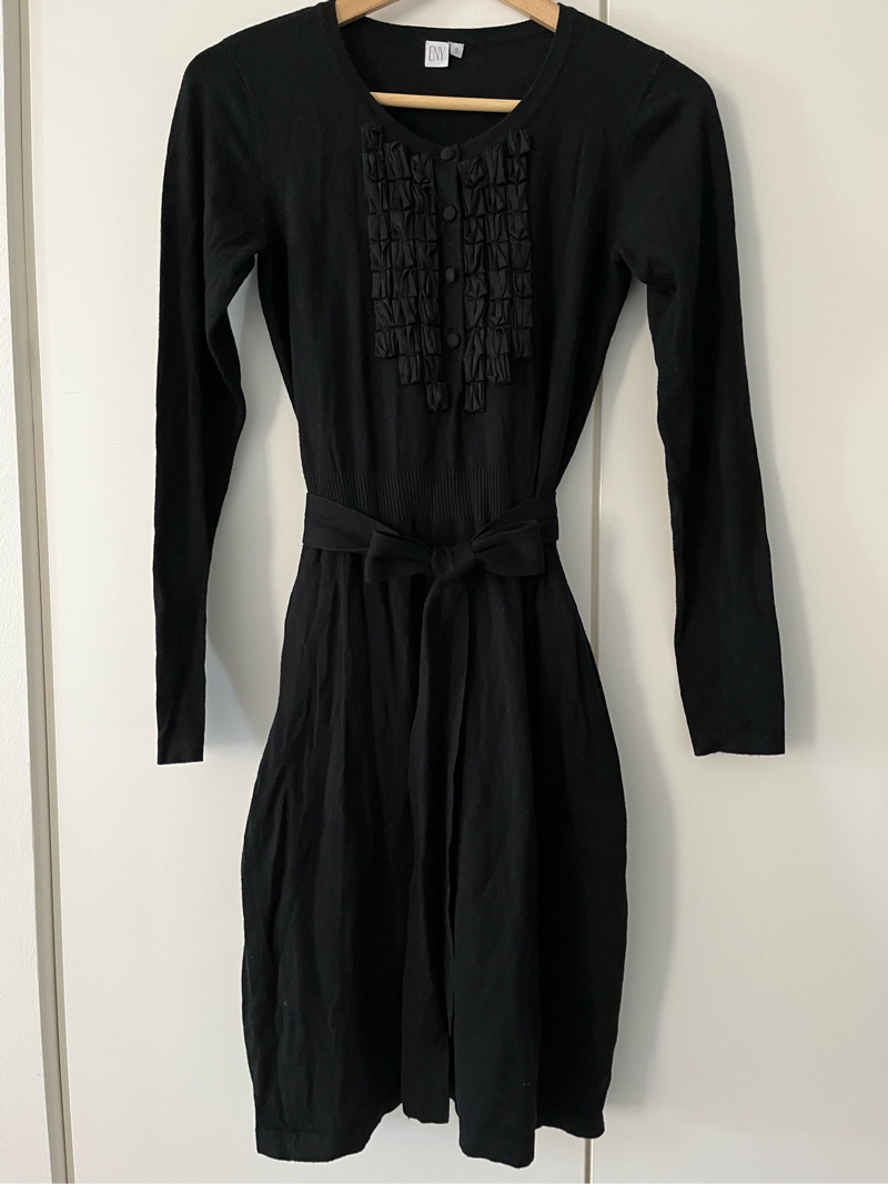 Musta pitkähihainen neulemekko vyöllä, nappi ja röyhelö yksityiskohdilla yläosassa. Koko S ja menee mielestäni myös M kokoiselle. Siistissä kunnossa