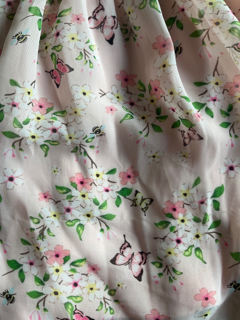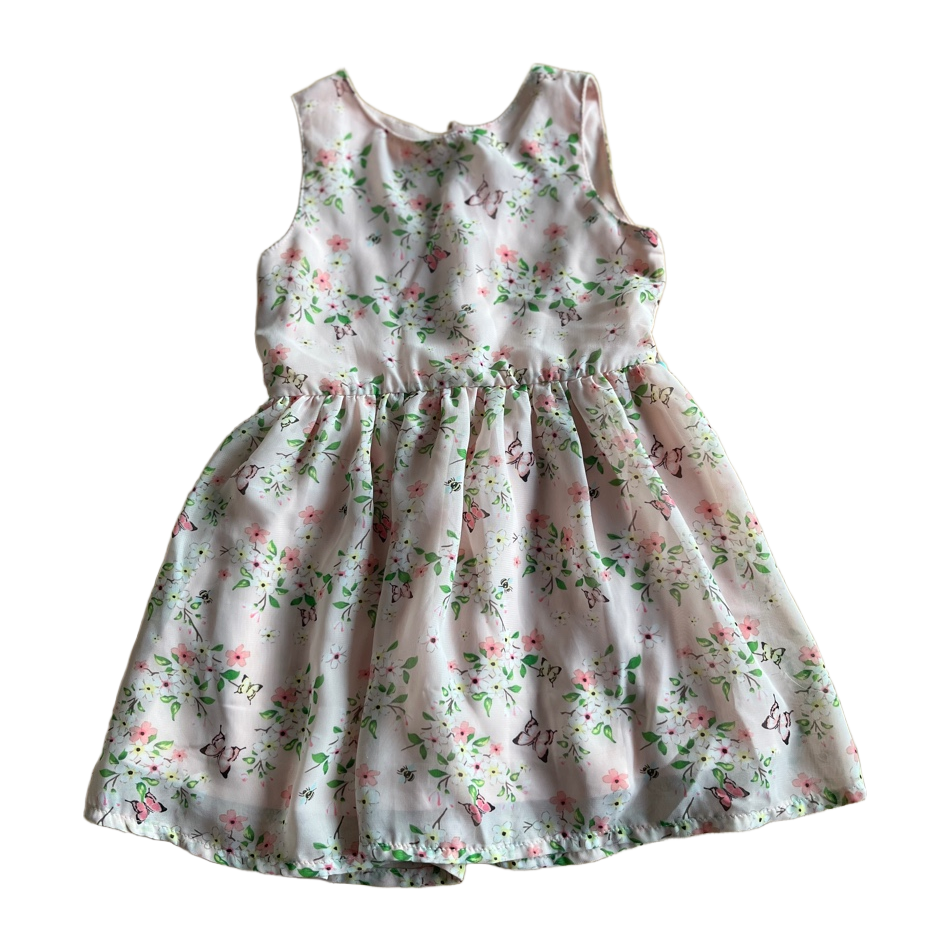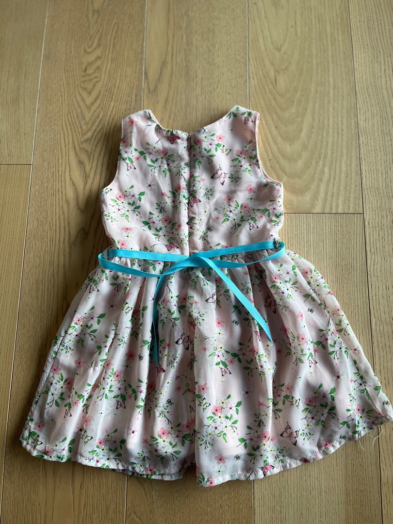 Ihana pienten tyttöjen mekko. Vaaleanpunaisella pohjalla kukkia ja perhosia. Sininen nauhayksityiskohta vyötäröllä.