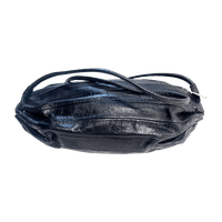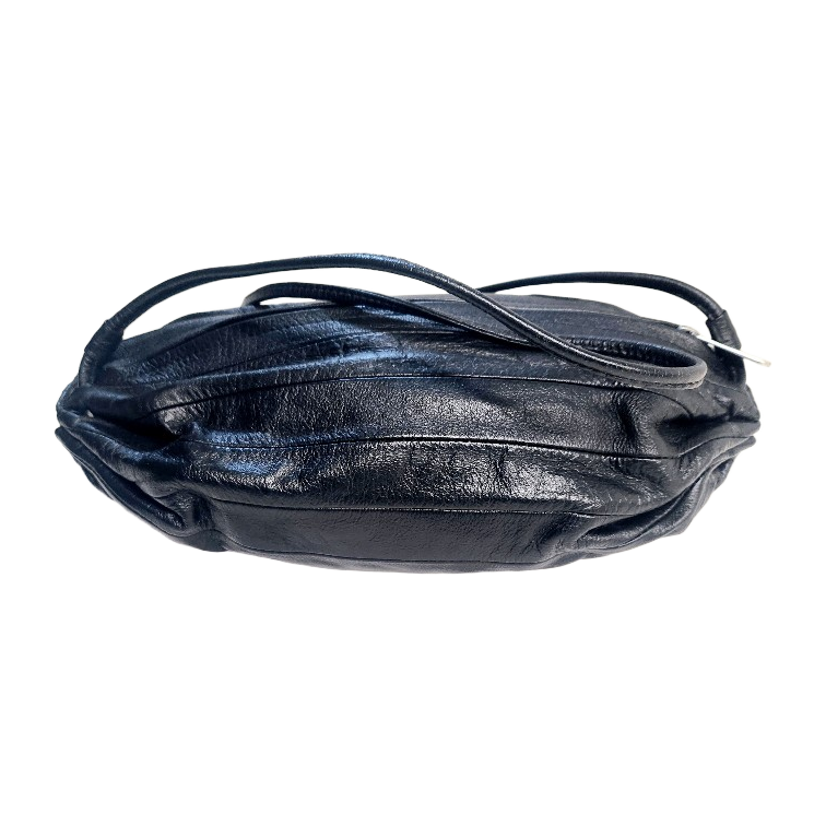 Mustaa nahkaa oleva Marimekon olkalaukku, hopeisilla metalleilla. Isompi koko. Suojapussi mukaan