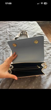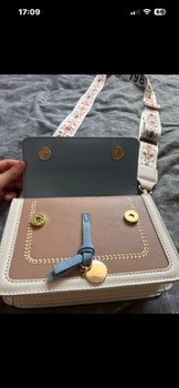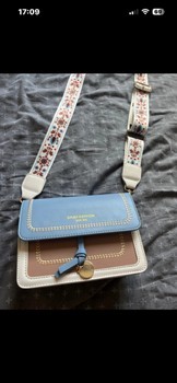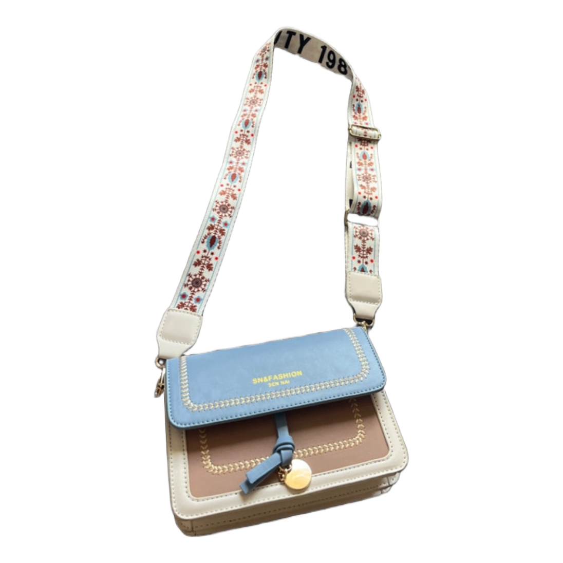 Small shoulder bag with a blue flap and brown body. Features an adjustable patterned shoulder strap and gold-tone hardware details.