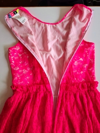Vuorattu, eli läpinäkymätön. Takana vetoketjusuljenta. Runsas helma, rintamuksessa pliseerattu paneeli. Pitsimateriaali on "tönkköä" eli pysyy muodossaan.
