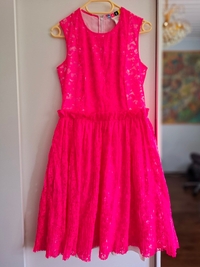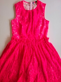 Elegant, cheerful pink lace dress with sleeveless design, perfect for special occasions.