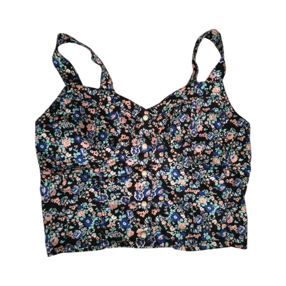 Musta kukkakuosinen olkaimellinen crop-top, etunapit.