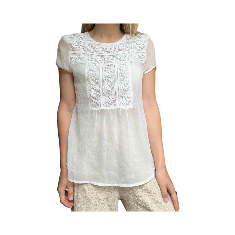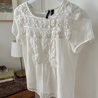 Mango seethrough white lace shirt sized M. Lace part has tiny pink colors. Very good condition! For reference I'm 163cm.