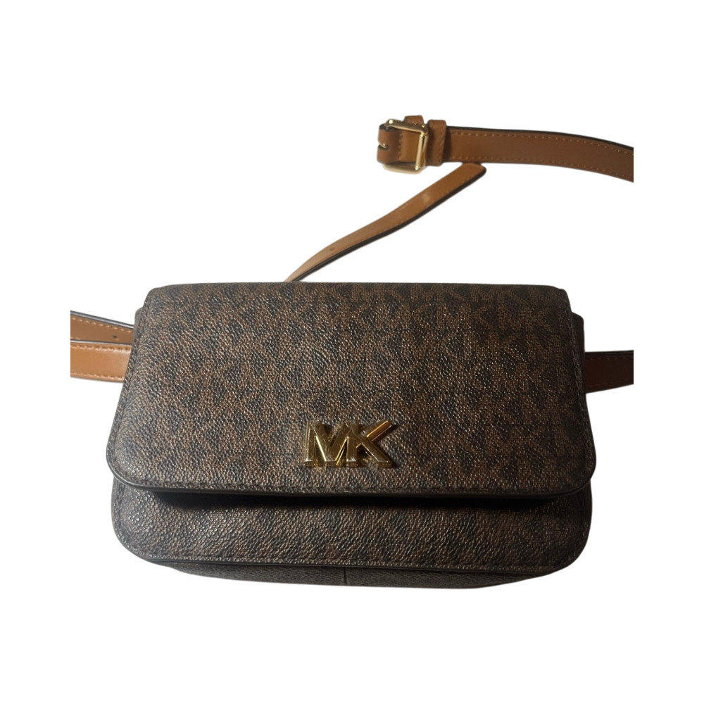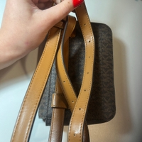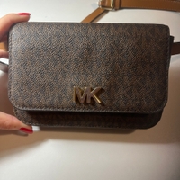 Small brown MK crossbody with adjustable leather strap.