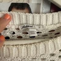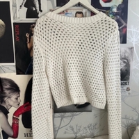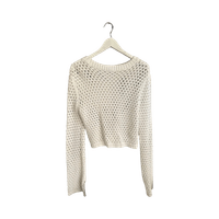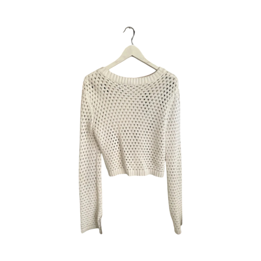 Cropped white open-knit long-sleeve sweater, lightweight and breathable. Flare sleeves.