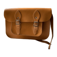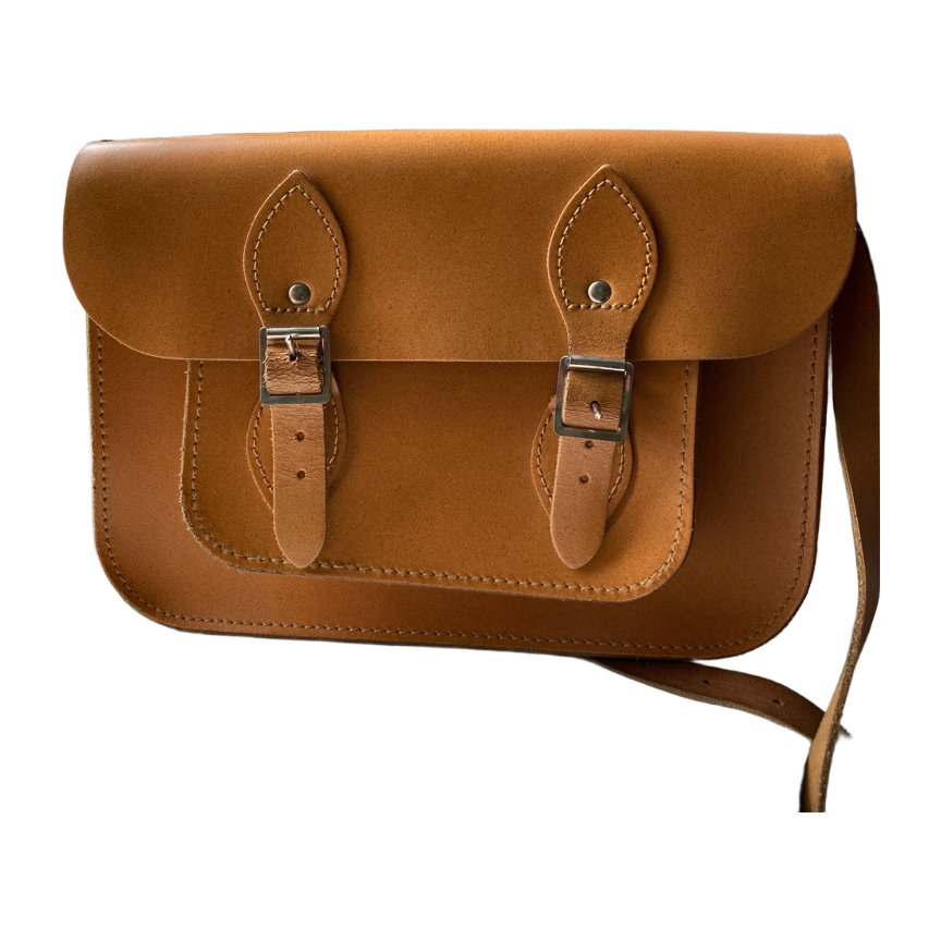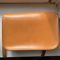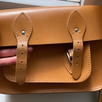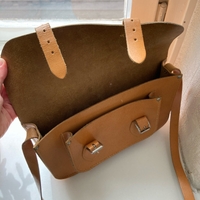 Vaaleanruskea/sinapinkellervä nahkainen satchel-tyylinen olkalaukku, jossa solkikiinnitys. Kiinnitysremmeissä kulumaa, muutoin hyvässä kunnossa.