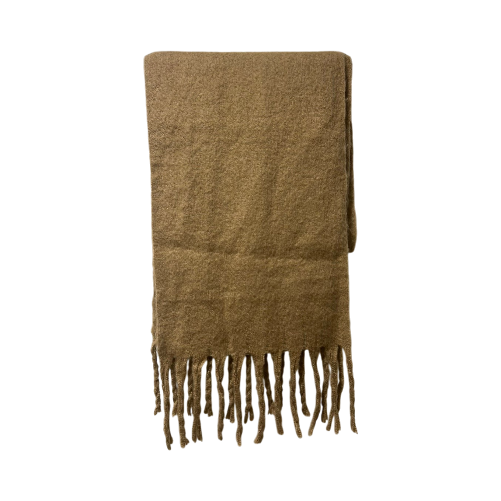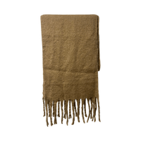Pehmeä, huopamainen pitkä huivi hapsureunuksella.