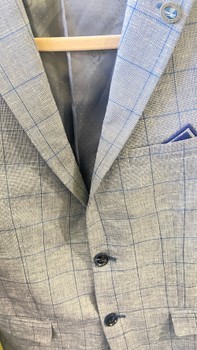 Slim fit blazer with a check pattern in grey. Features a button closure, pocket square detail, and branded inner lining. Size 46.