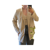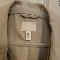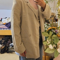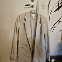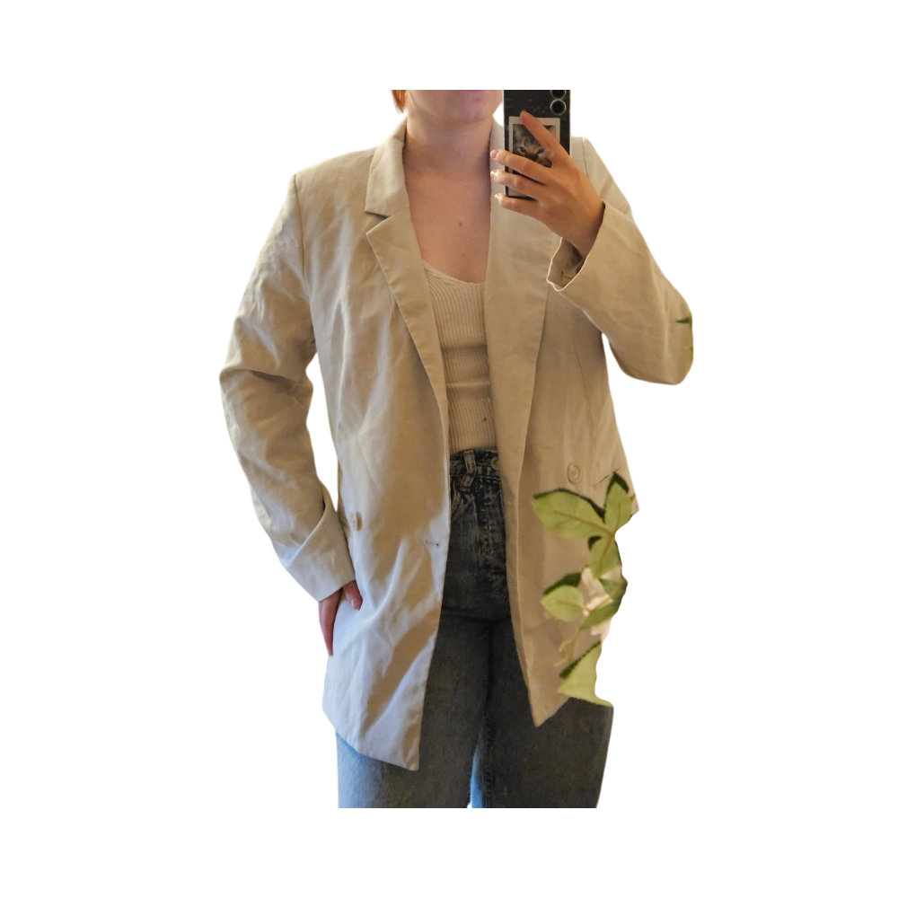 Kuvassa s kokoisen päällä, istuu siis melko väljästi. Siisti muuten, mutta ryppyyntyvä. Feikkitaskut. Väri vaalean harmaa/beigehtävä. Kevyet olkatoppaukset (itse en tykkää olkatoppauksista mutta tätä ei haitannu käyttää ku niin ohkaset ne toppaukset).