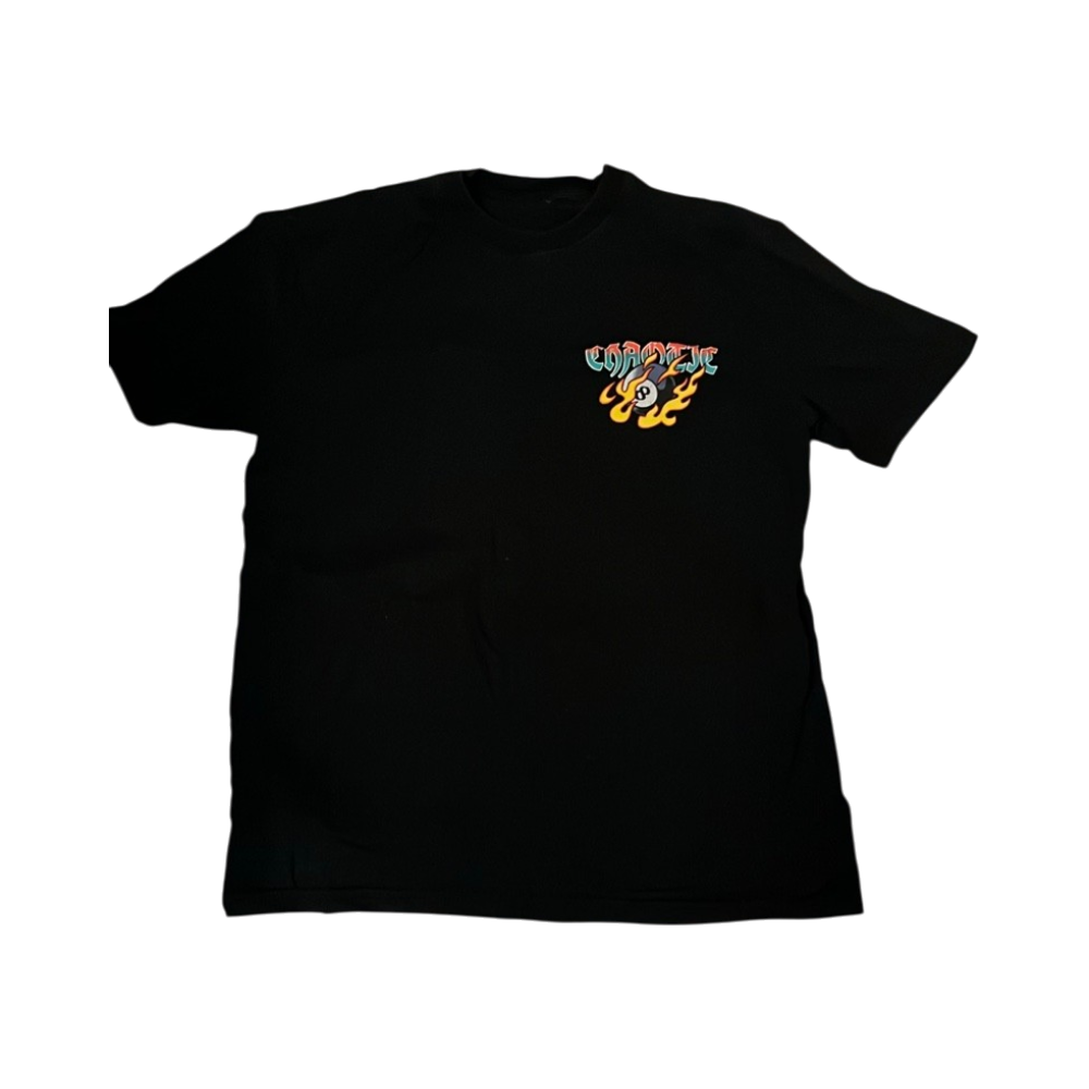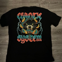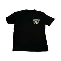 Musta miesten t-paita suurella värikkäällä printillä.