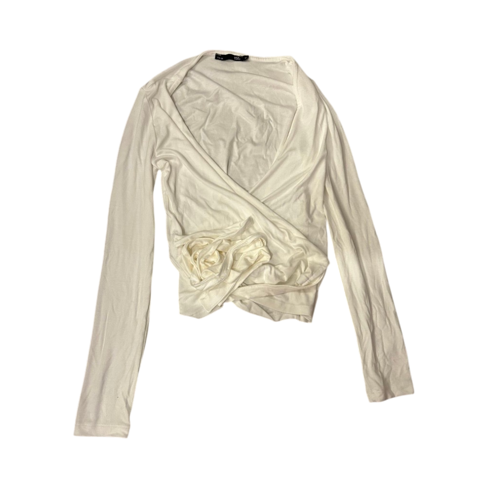 Valkoinen pitkähihaisen kietaisupaita, ohutta joustavaa kangasta.