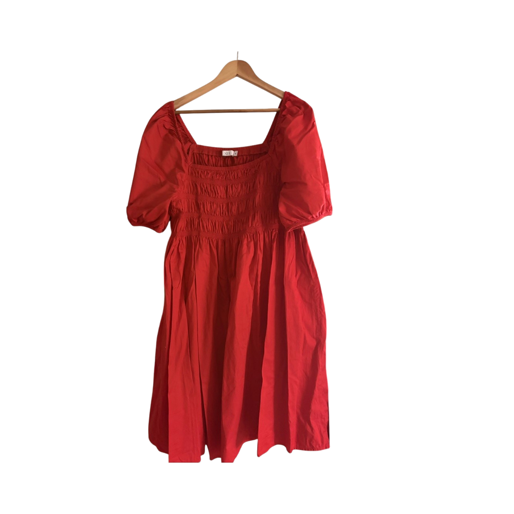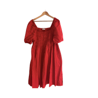 Lyhyt punainen mekko, smokkirypytykselläja lyhyillä puhvimaisilla hihoilla. Ei käytetty.