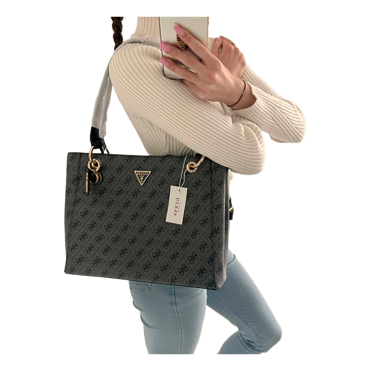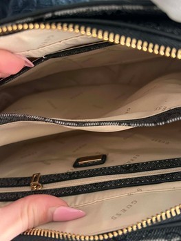 Guess shoulder bag with monogram pattern and gold-tone hardware. Features a top zip closure and internal compartments.