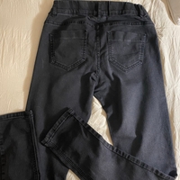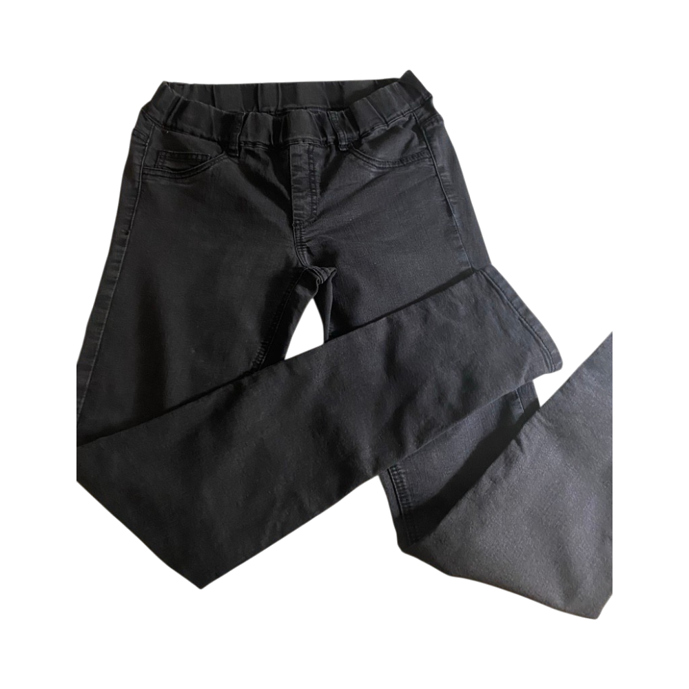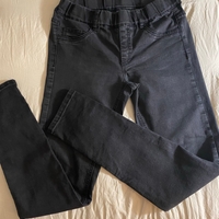 High-waist black skinny jeans with elastic waistband.