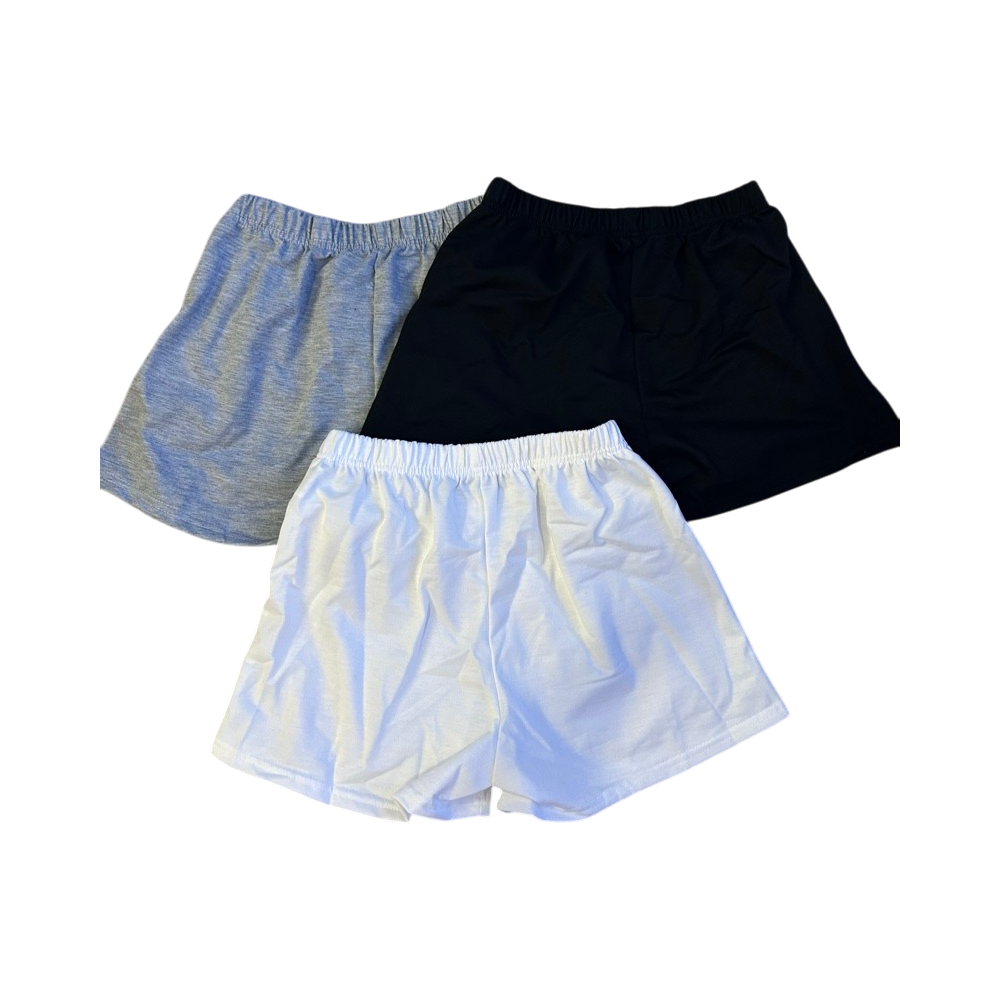 Kolme paria elastisia urheilushortseja, valkoiset, mustat, harmaat.