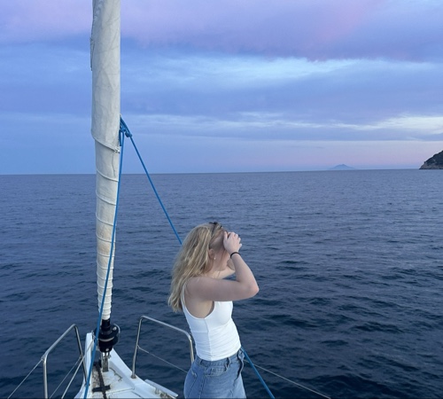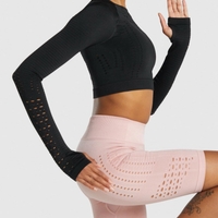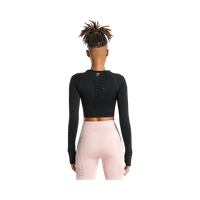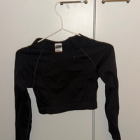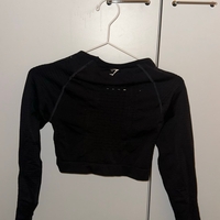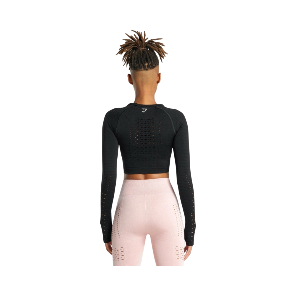 Black seamless cropped workout top, long sleeves, thumbholes.