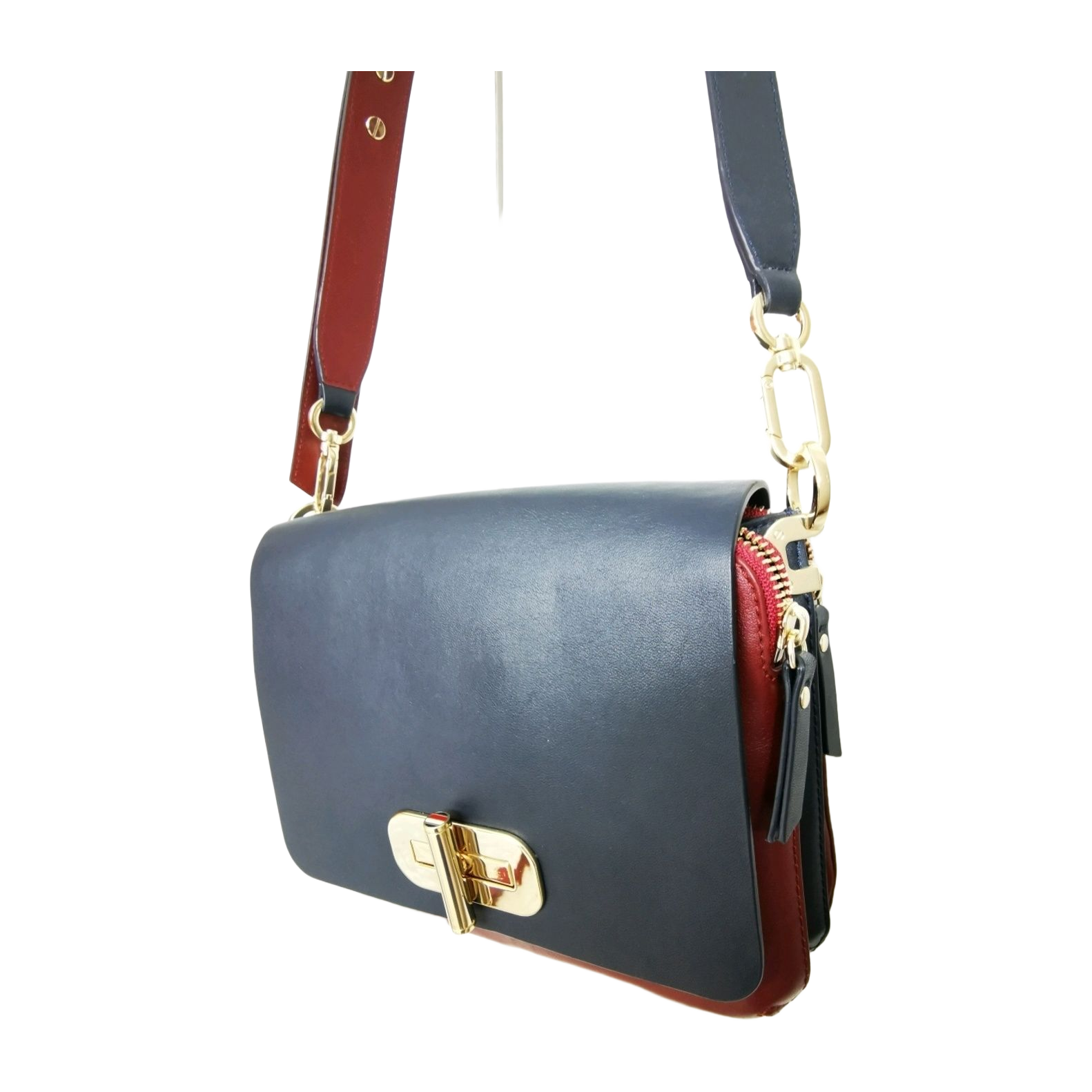 Tommy Hilfigerin näppärä #nahkalaukku. Läpän alla kaksi vetoketjullista lokeroa ja keskellä lokero magneettikiinnityksellä.