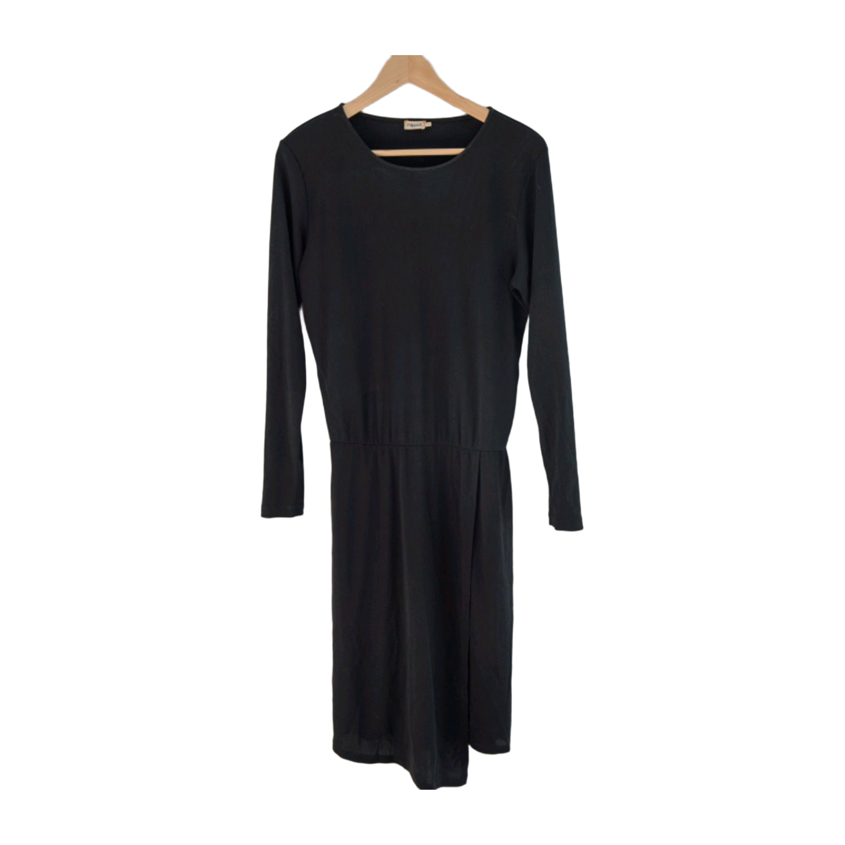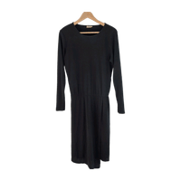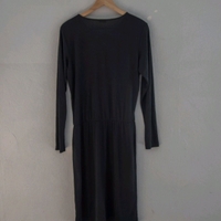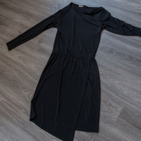 Long sleeved black dress. Knee length. Flowy lightweight fabric. Asymmetrical wrap skirt, elastic waist. Very comfortable.