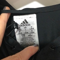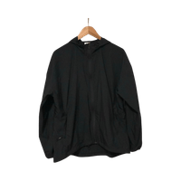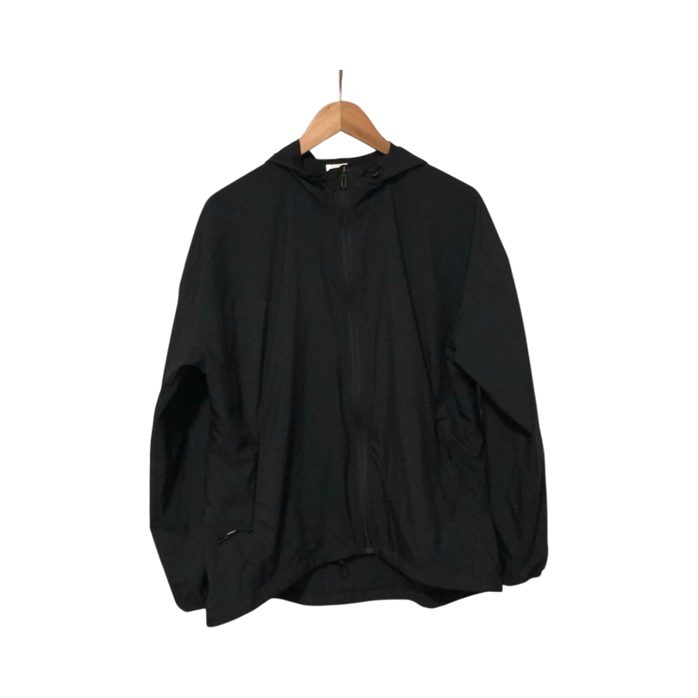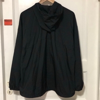 Kevyt, musta adidas tuulitakki hupulla, vetoketju edessä.