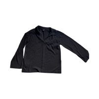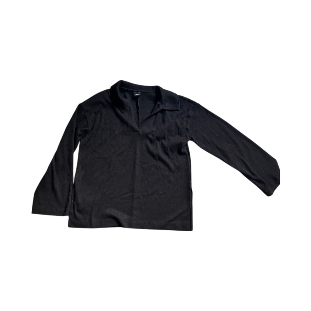 Kevyt musta pikeeneule, pitkähihaiset ja kaulus.