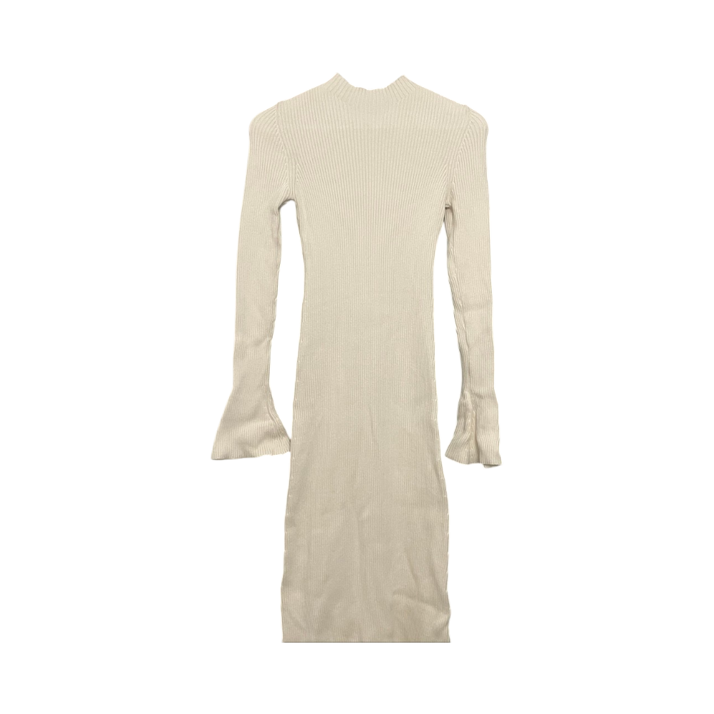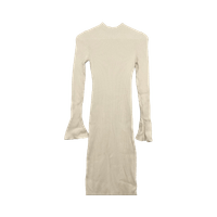 Pitkä ribbineulottu mekko, kellotetut hihat, vyötäröä myötäilevä.